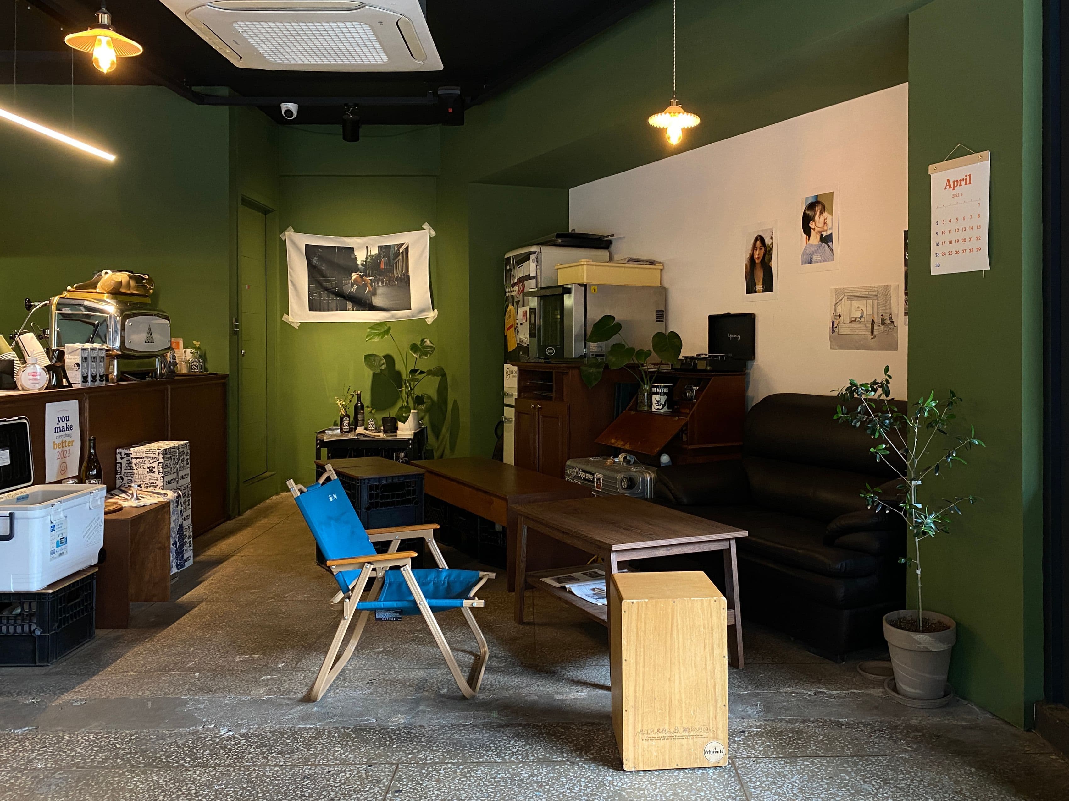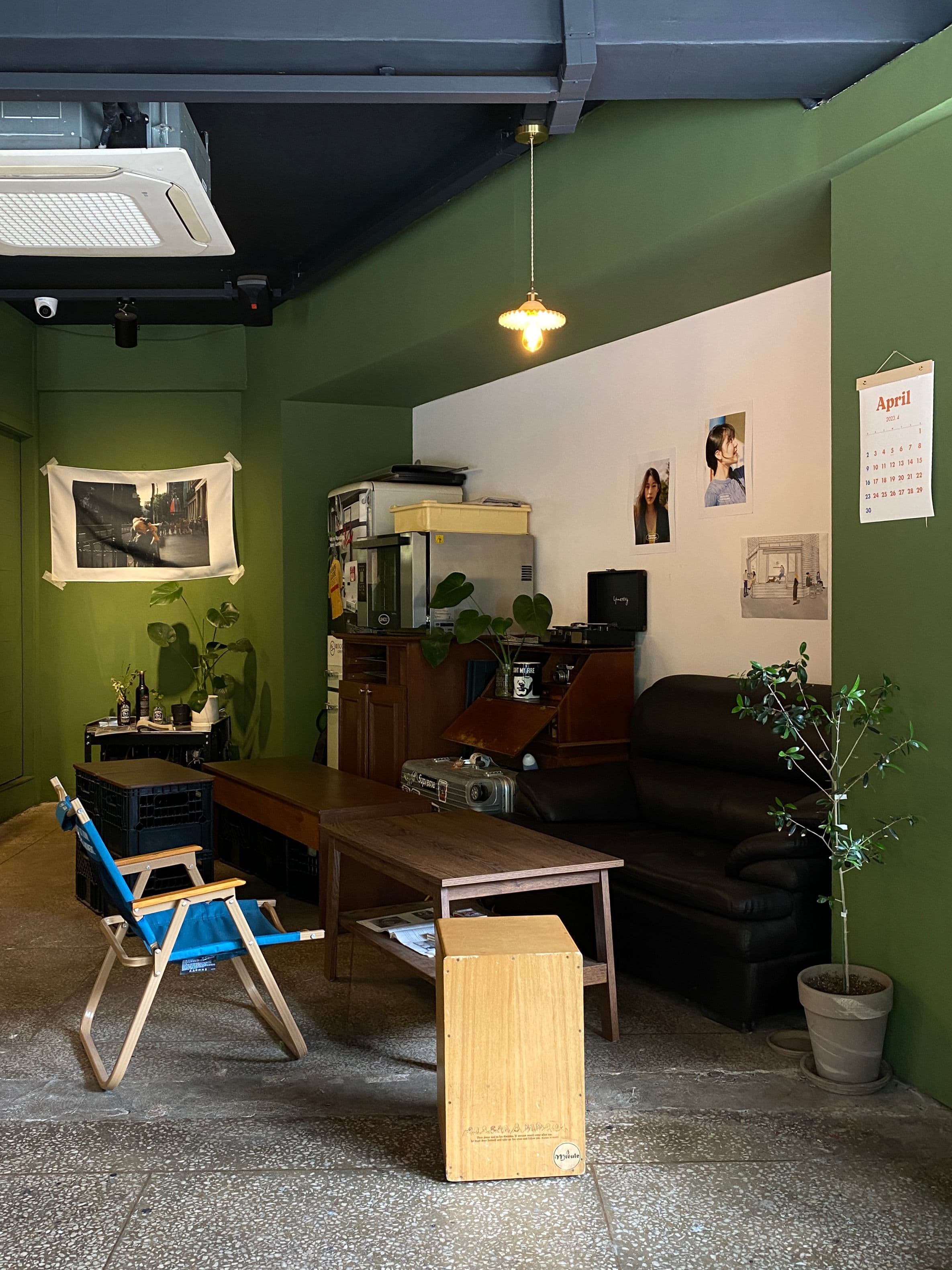 카페 안에는 조명이 많지는 않았지만, 큰 창 너머로 들어오는 햇빛 덕분에 아주 어둡게 느껴지지는 않았어요. 캠핑 의자와 오래된 소파, 우유 상자로 만든 테이블도 눈에 띄었습니다. 자유롭고 투박하지만 동시에 편안한 분위기가 느껴졌어요. 올리브그린 색으로 칠한 벽은 따뜻하고 아늑한 느낌을 더해주는 것 같았고요.