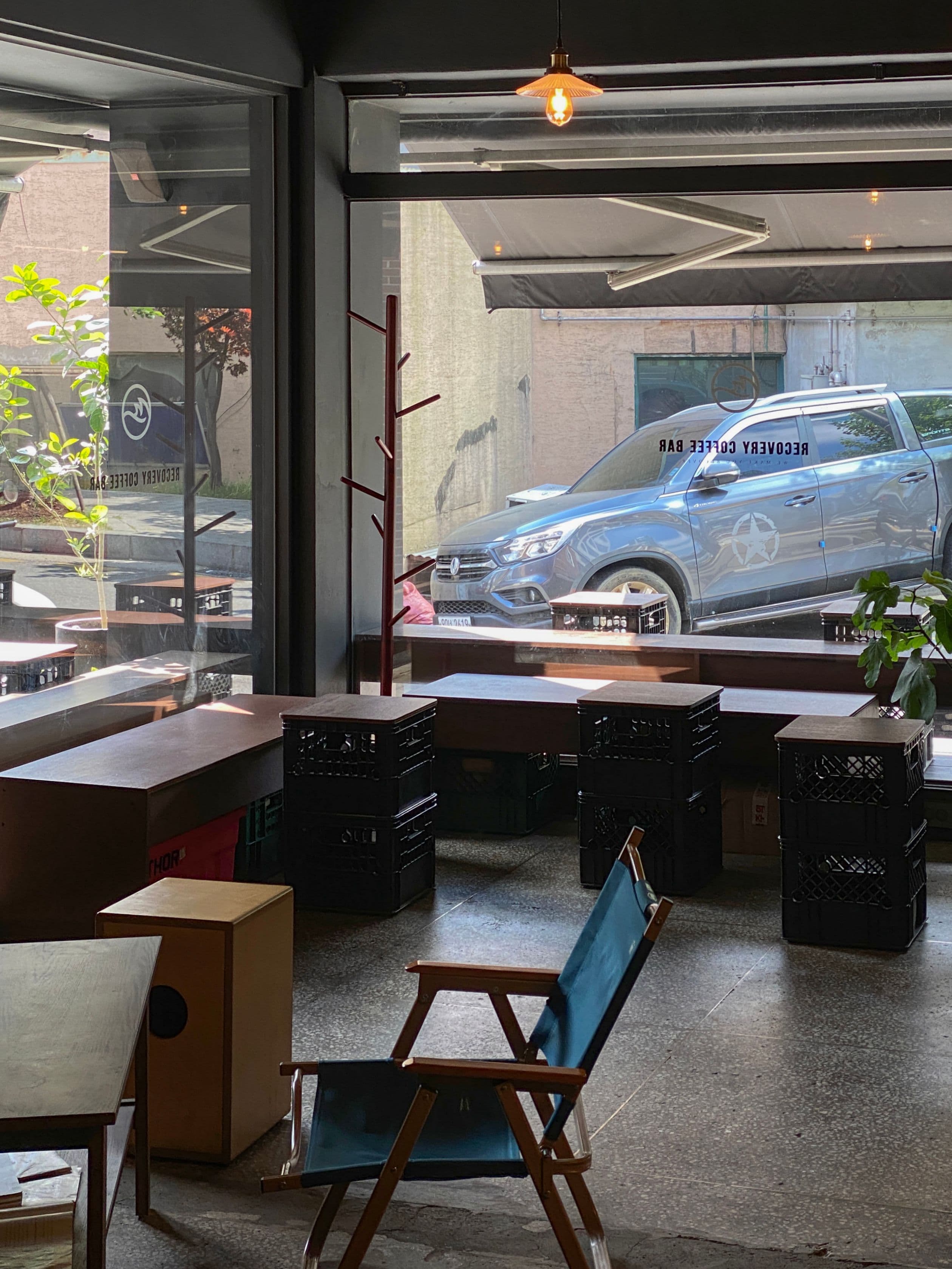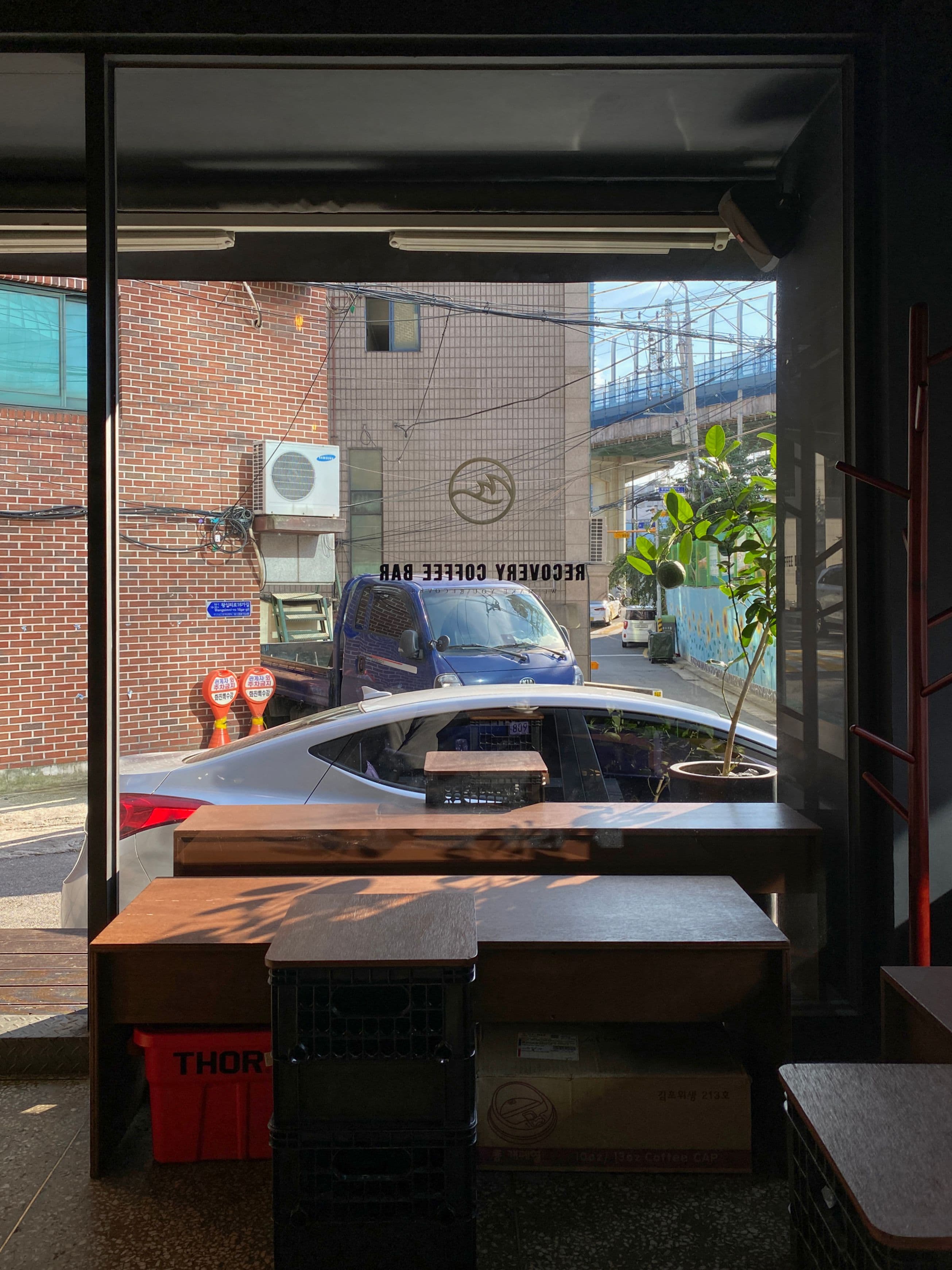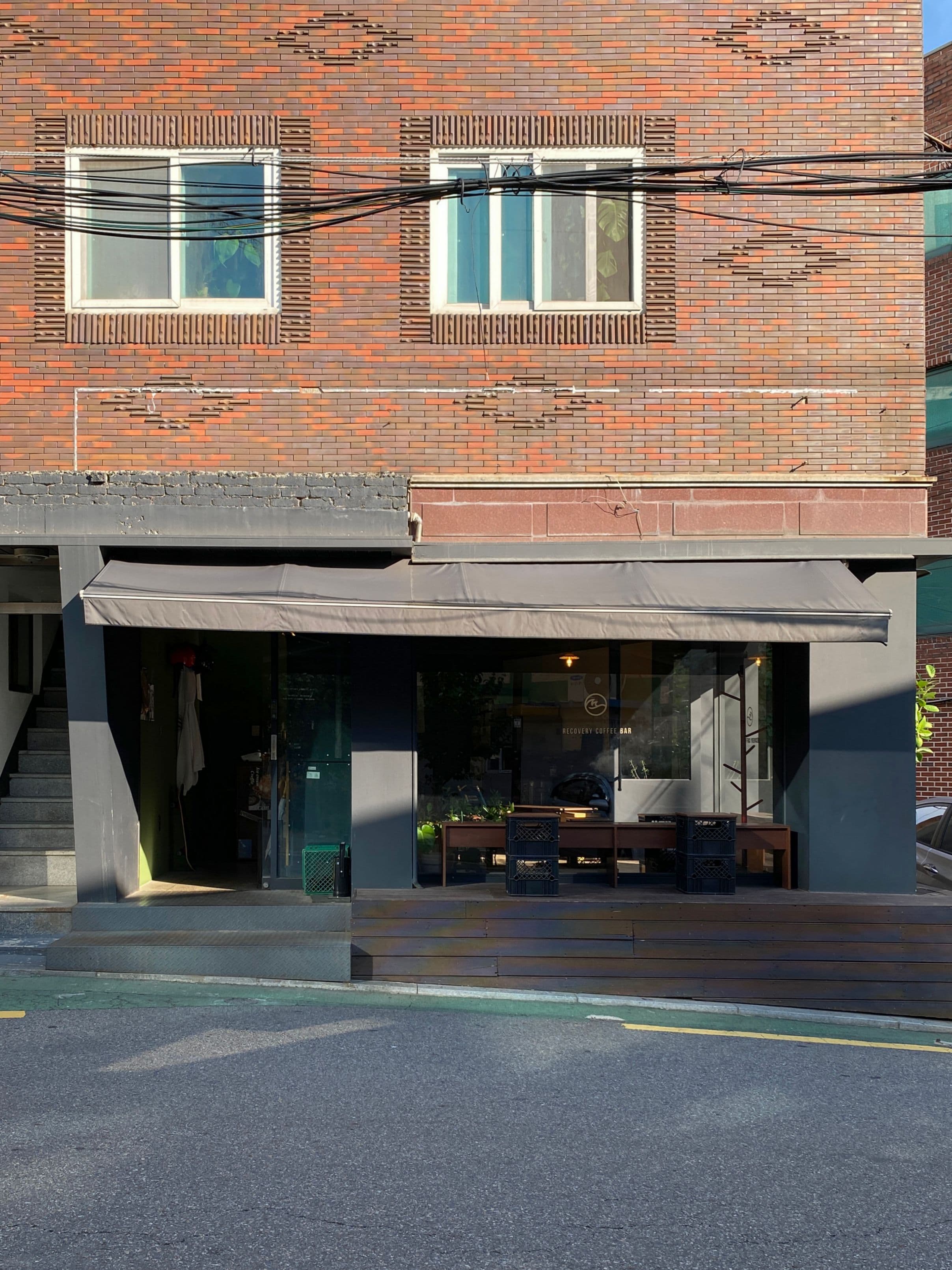 블루보틀 건물 뒤편 골목길에는 주택이나 오래된 철물점같이 생활이 묻어나는 건물이 이어져 있어요. 골목 깊숙이 걸어가다 ‘이런 곳에도 카페가 있을까’ 하는 의구심이 들 때쯤, 테라스에 놓인 벤치와 테이블이 눈에 띕니다. 리커버리 커피바는 어두운 외관에 간판도 없어 하마터면 그냥 지나치기 쉬워요. 한적한 주택가에서 마치 보호색처럼 자리한 이곳을 소개할게요.