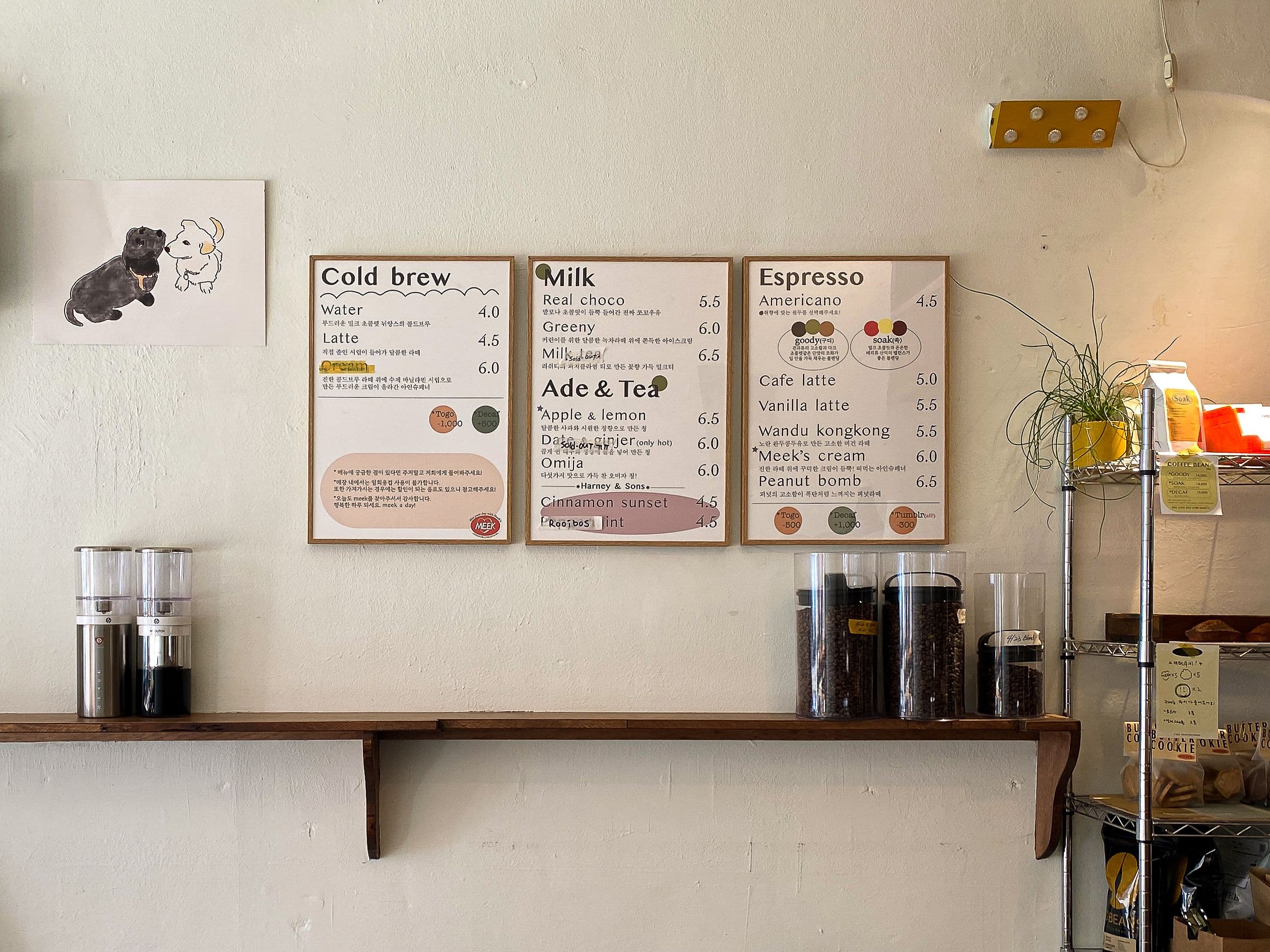 아담한 카페 내부는 고소한 커피 향기로 가득합니다. 음료 제조 공간 뒤편에서는 직접 원두를 로스팅하는 사장님의 모습을 볼 수도 있어요. 음료를 주문할 때 취향에 따라 원두를 선택할 수 있고요. 쿠키나 피낭시에 등 커피와 함께하면 더 좋은 베이커리 메뉴도 준비되어 있습니다.