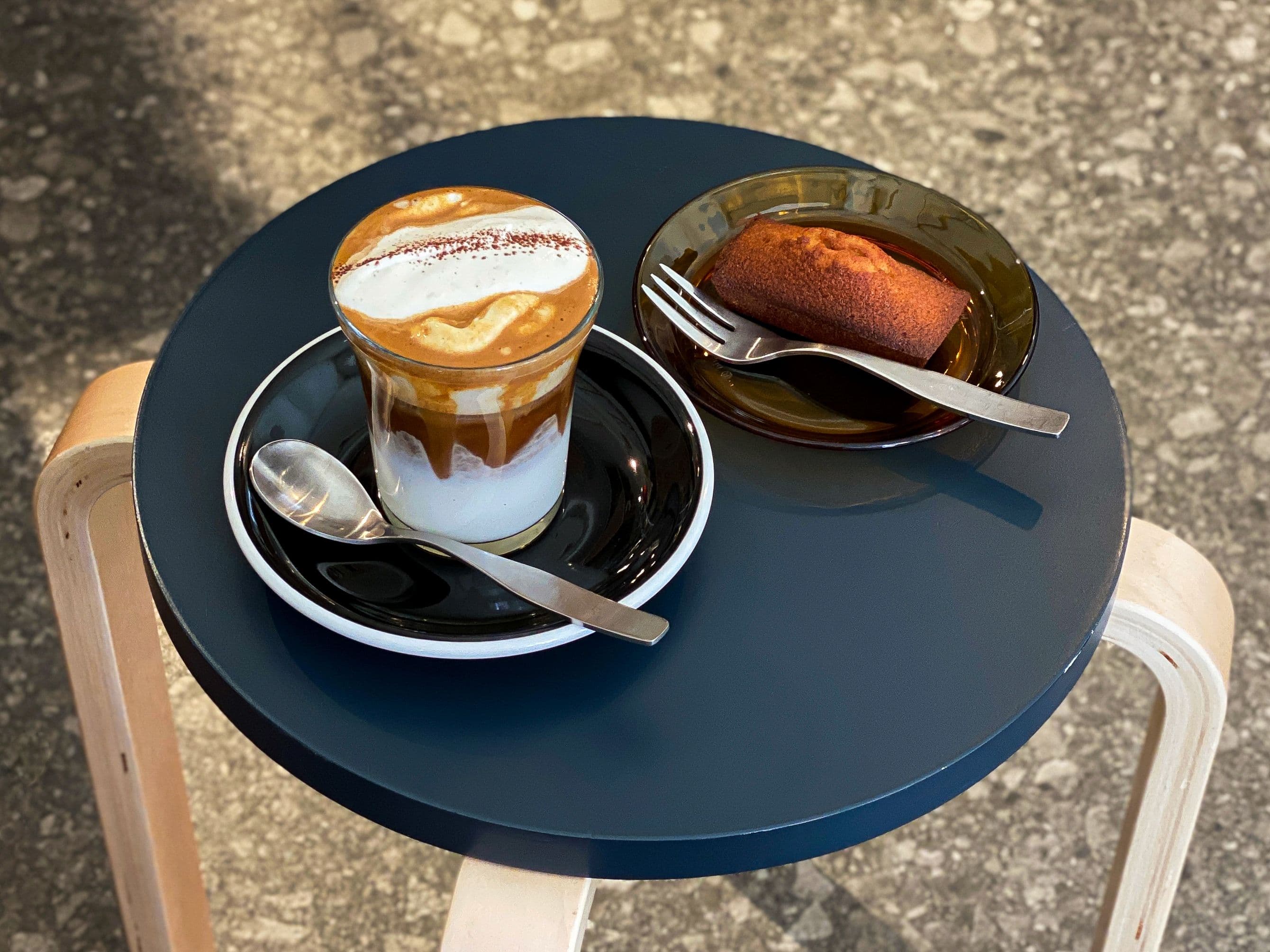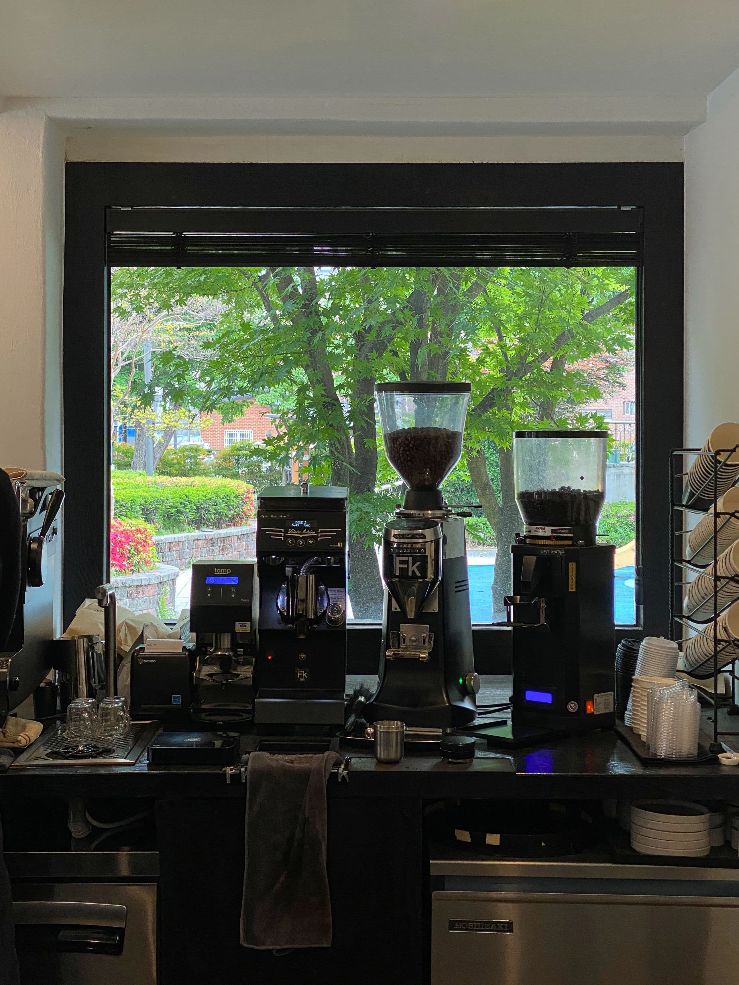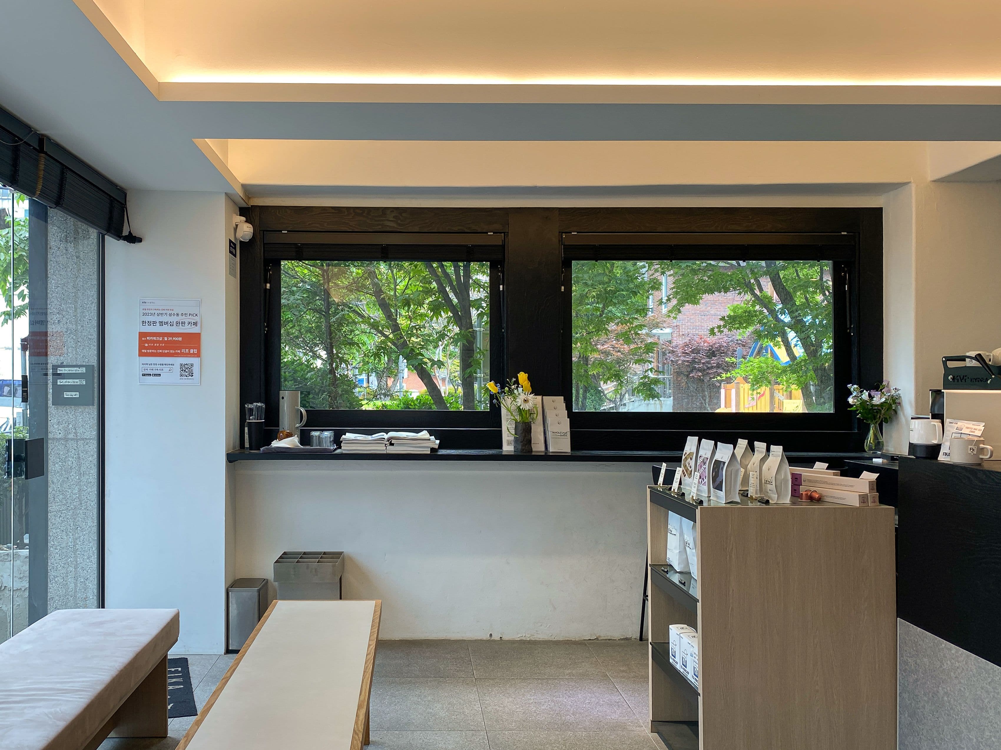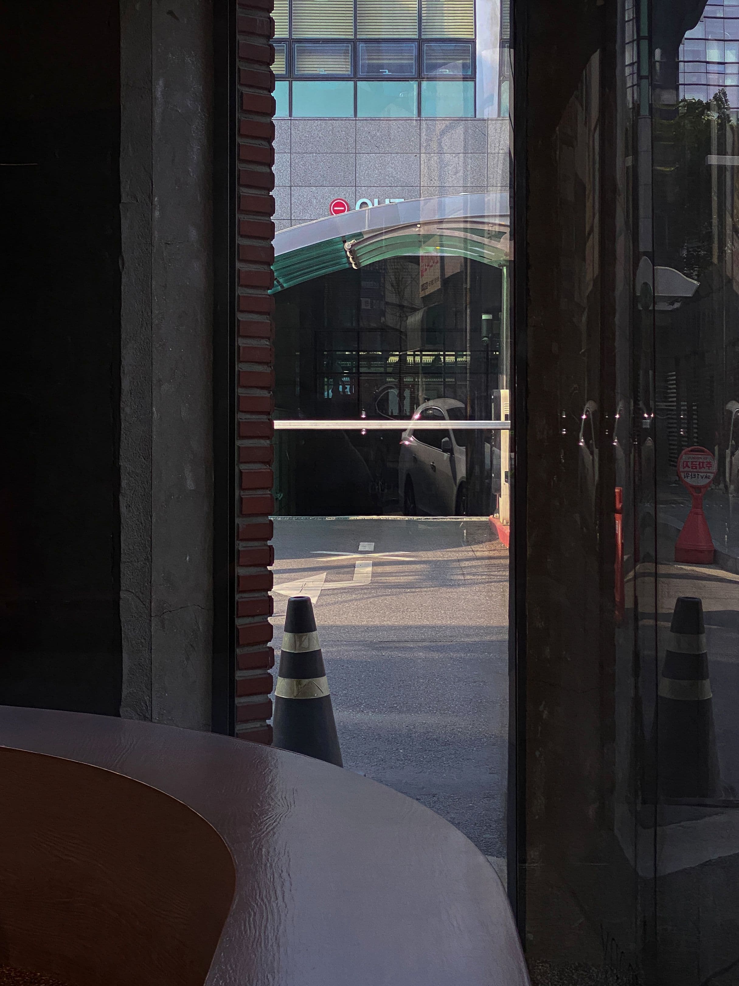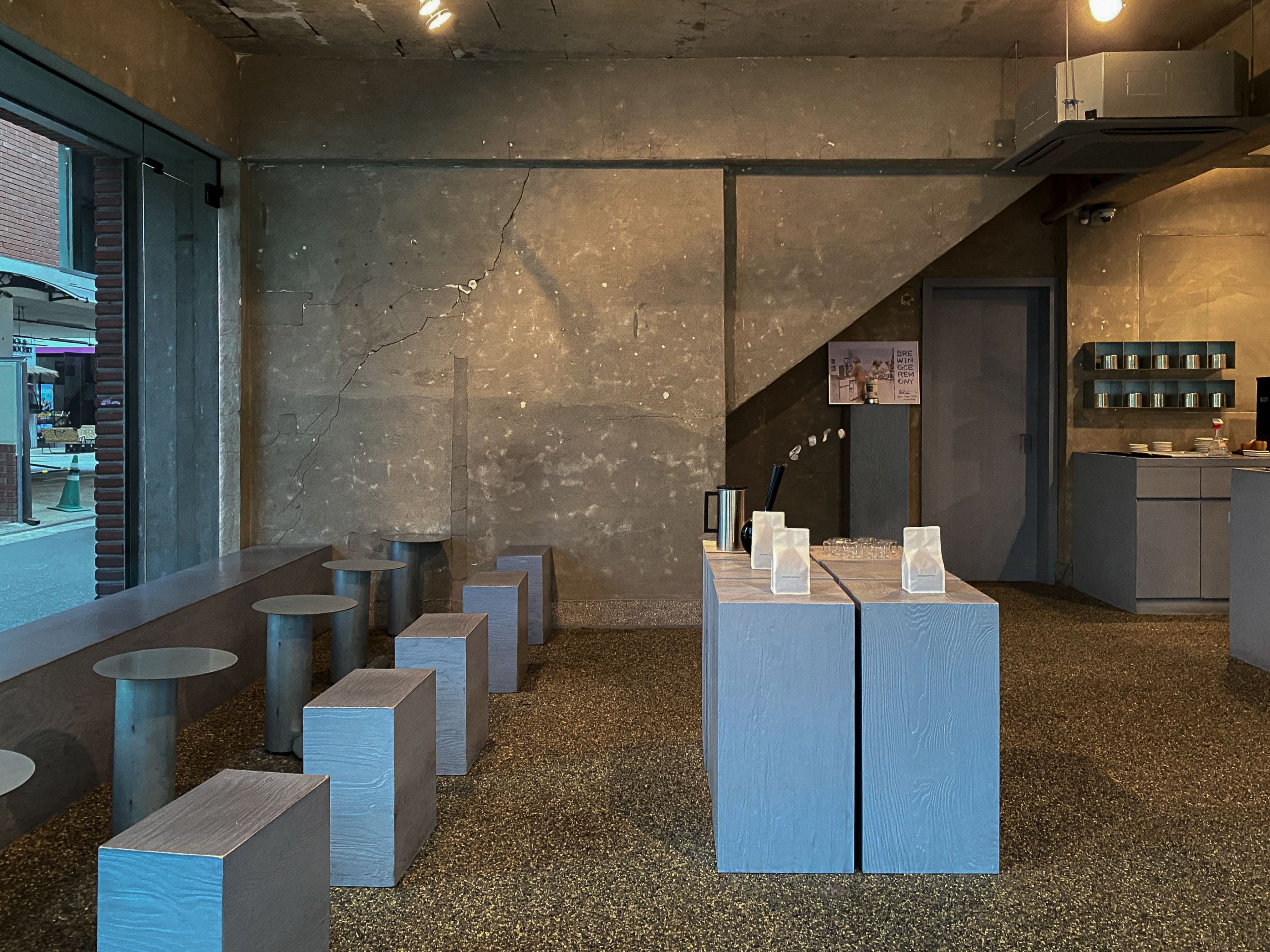 문을 열면 바깥 풍경과는 사뭇 다른 느낌의 공간을 만나게 됩니다. 공간에 들어서면 커피 향기와 함께 클래식 음악이 흐르고, 정갈하게 놓인 스툴과 테이블이 눈에 들어왔어요. 밖에서는 안이 보이지 않고, 안에서는 밖이 보이지 않는 유리창이 복잡한 도심과 카페 공간을 분리시키는 하나의 장치라는 생각이 들었습니다.