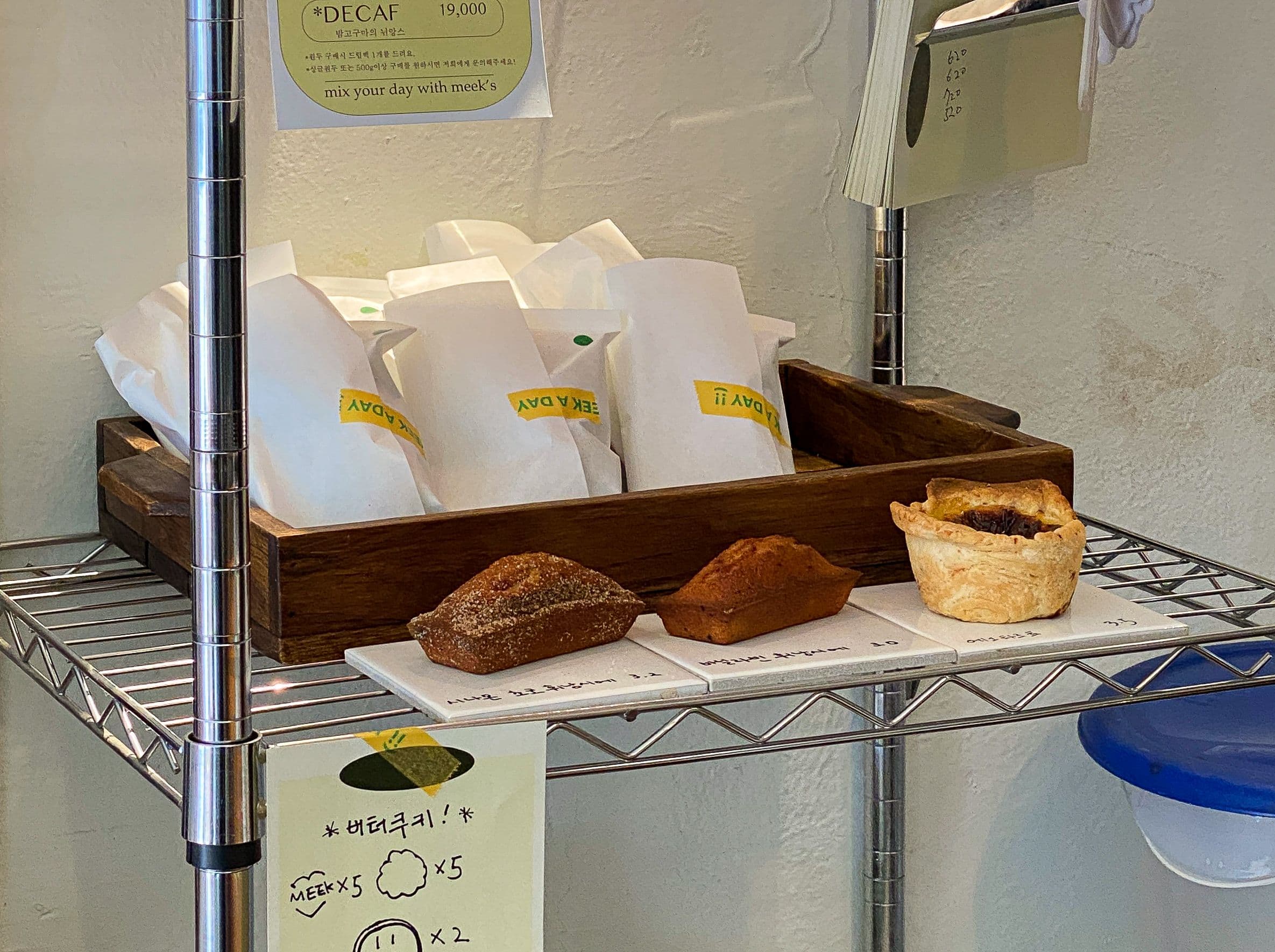 나른한 오후에 당 충전만 한 게 있을까요? 미크 로스터리의 시그니처 메뉴 ‘Meek’s Cream’과 피낭시에면 오후를 깨우기에 충분합니다. ‘Meek’s Cream’은 고소한 라테 위에 크림을 가득 올린 아인슈페너인데요. 쫀쫀한 크림에 부드러운 피낭시에를 콕 찍어 먹는 조합을 적극 추천해 주셨어요. 달콤한 커피와 함께 한 낮의 휴식을 즐기고 싶으시다면 미크 로스터리가 제격일 겁니다.