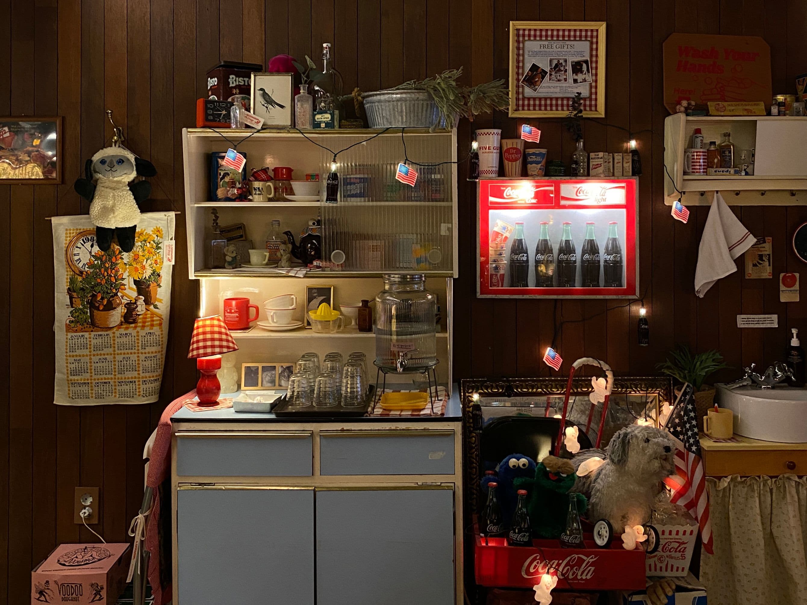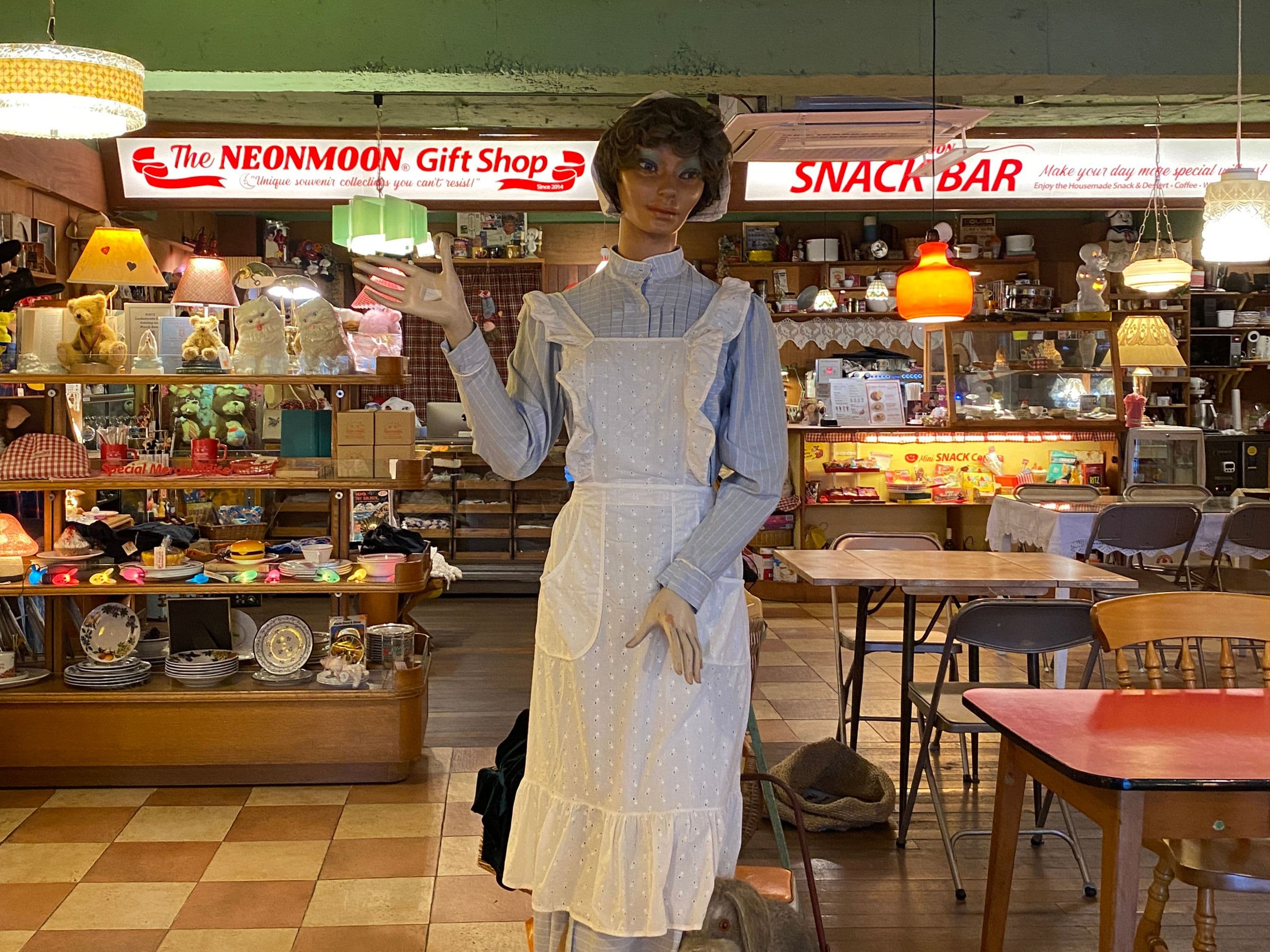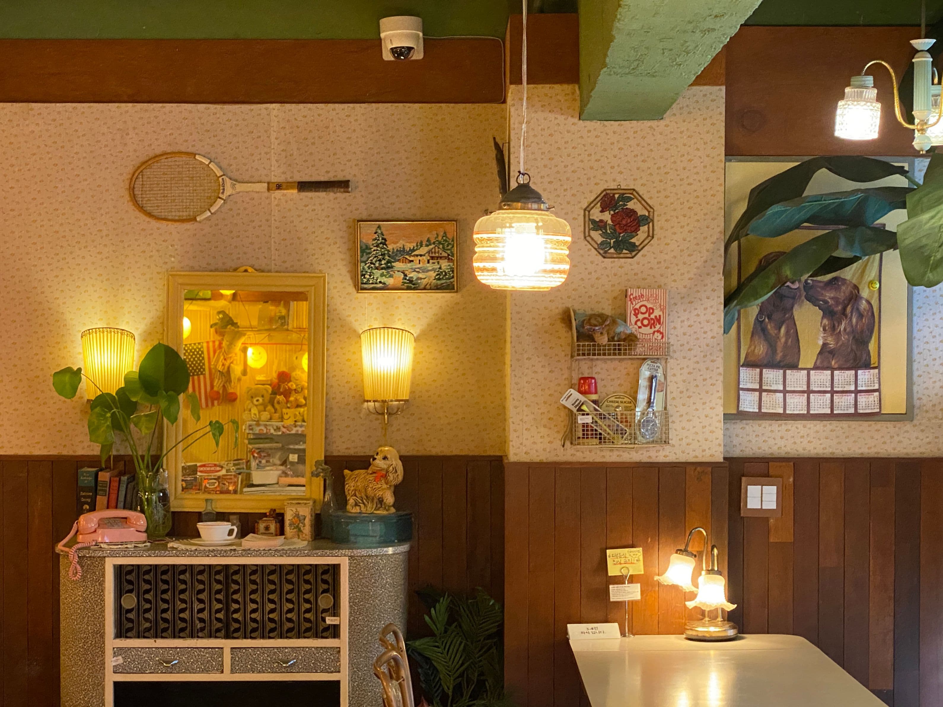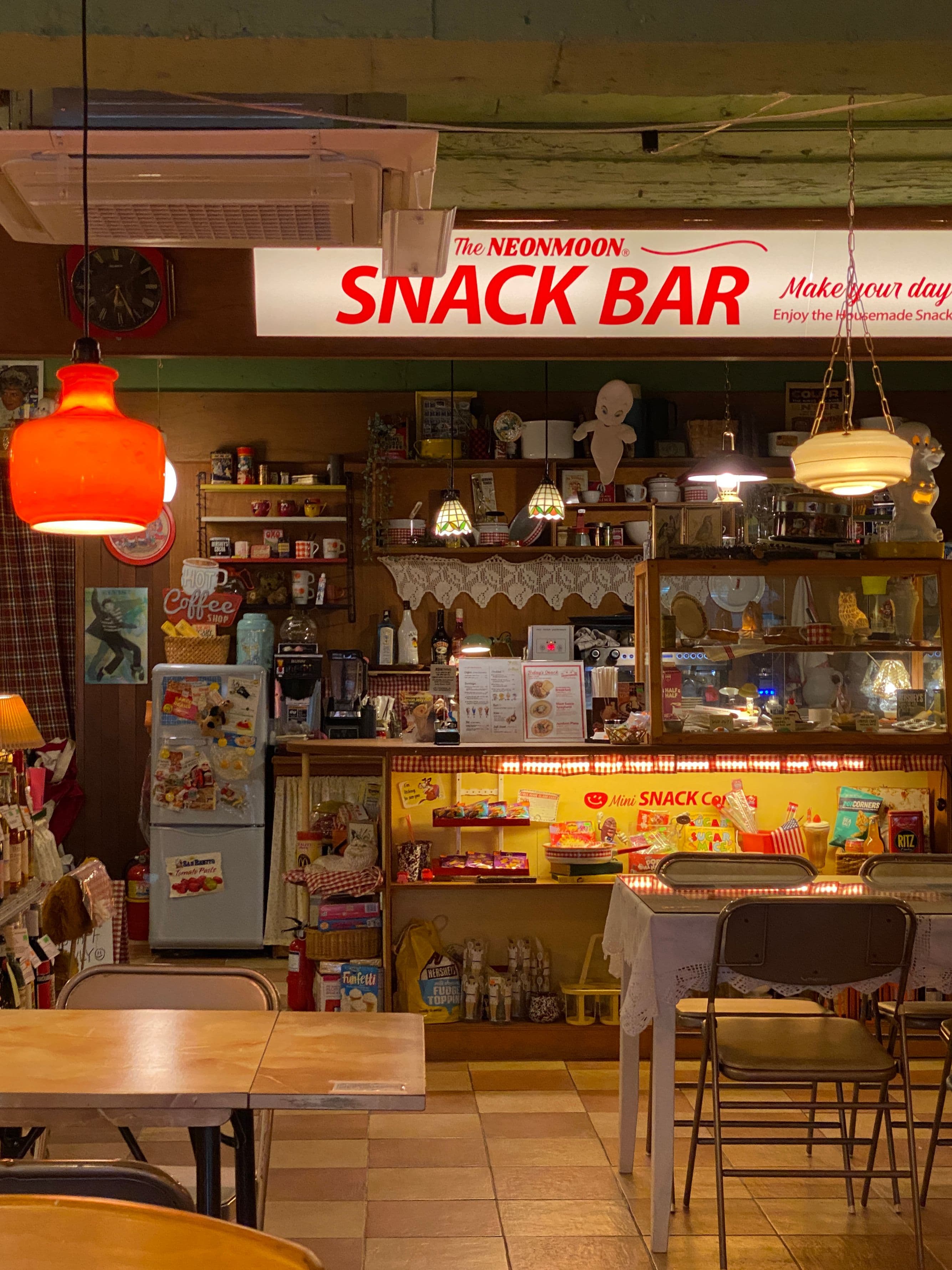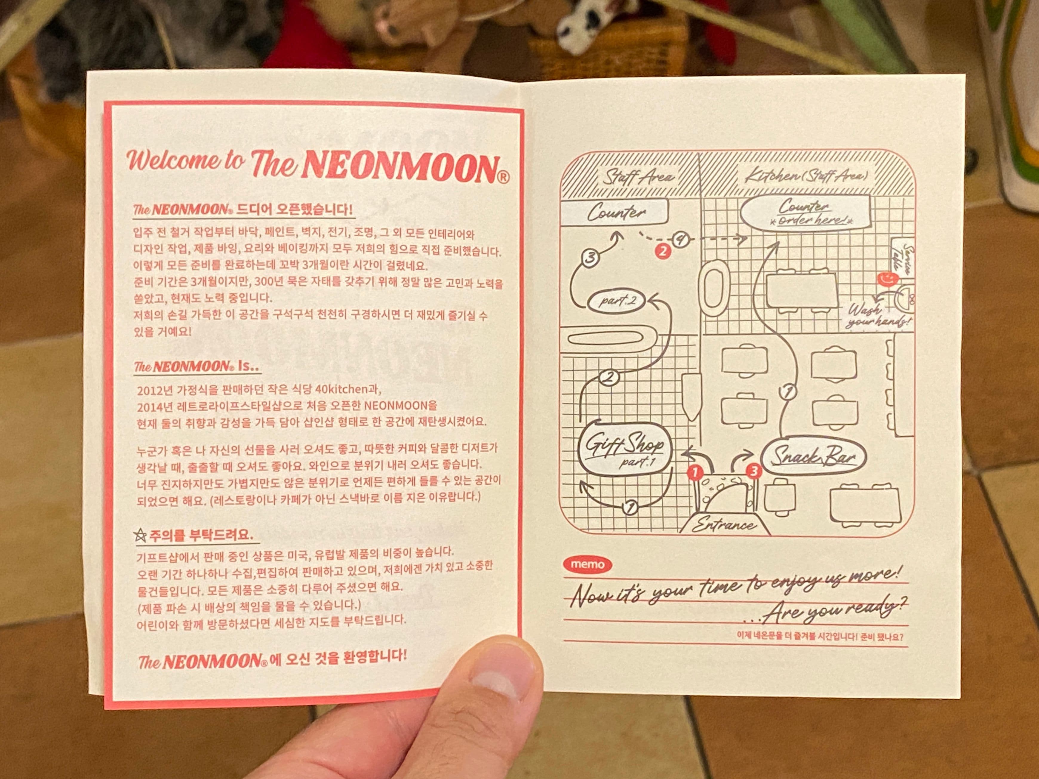 입구에 들어서면 아늑하고 안락한 분위기와 레트로 감성이 짙게 묻어나는 공간이 눈 앞에 펼쳐지는데요, 마치 미국 어느 시골의 다이닝 바에 들어온 것 같은 기분이 듭니다. 경험해 본 적 없는 1950-60년대의 미국 시골의 작은 가게는 이런 느낌이었을까 하는 생각이 들 정도예요. 더 네온문은 기프트샵과 스낵바로 공간을 나눌 수 있습니다. 기프트샵에는 공간을 소개하는 안내문도 비치되어 있어요.