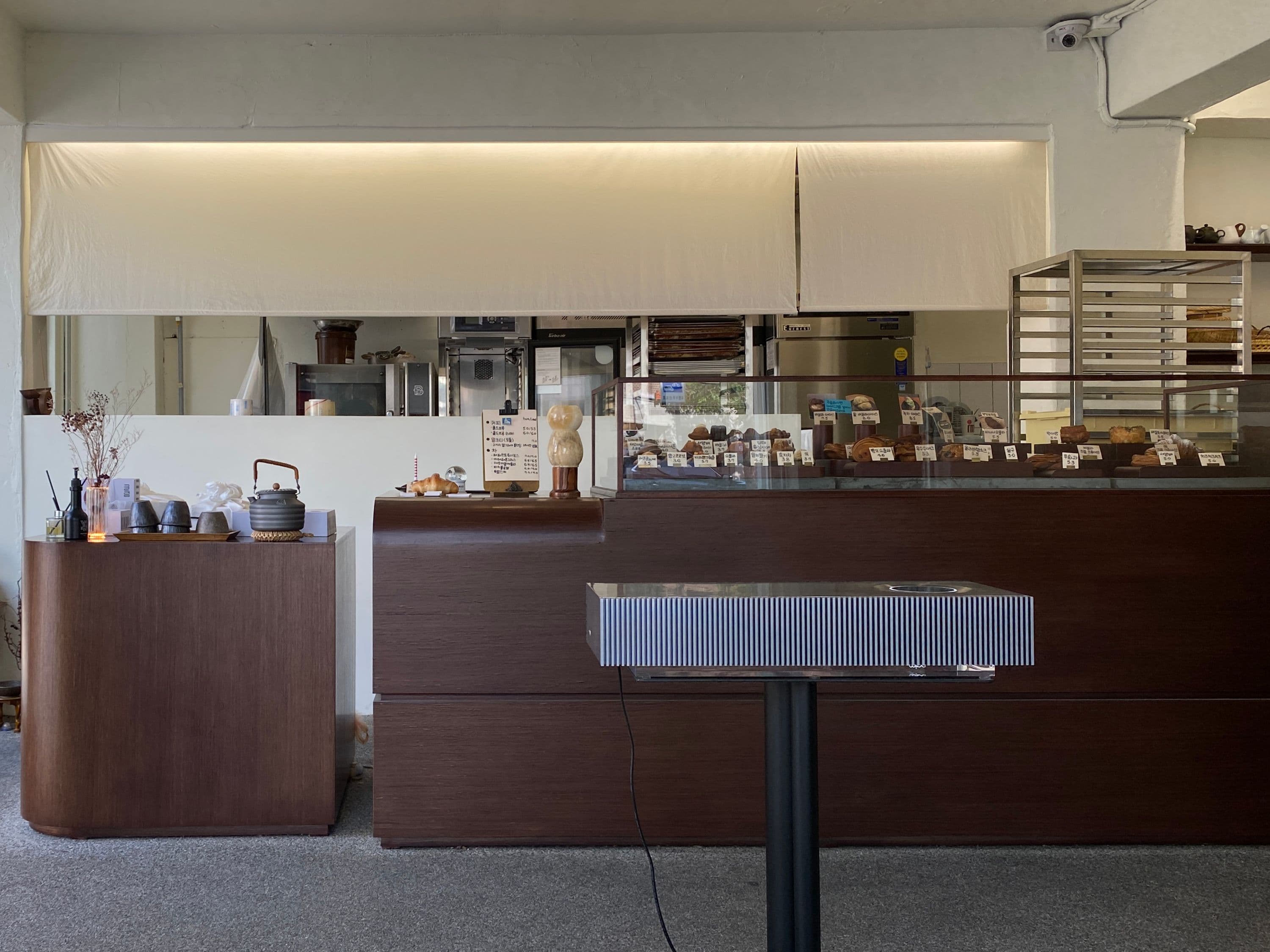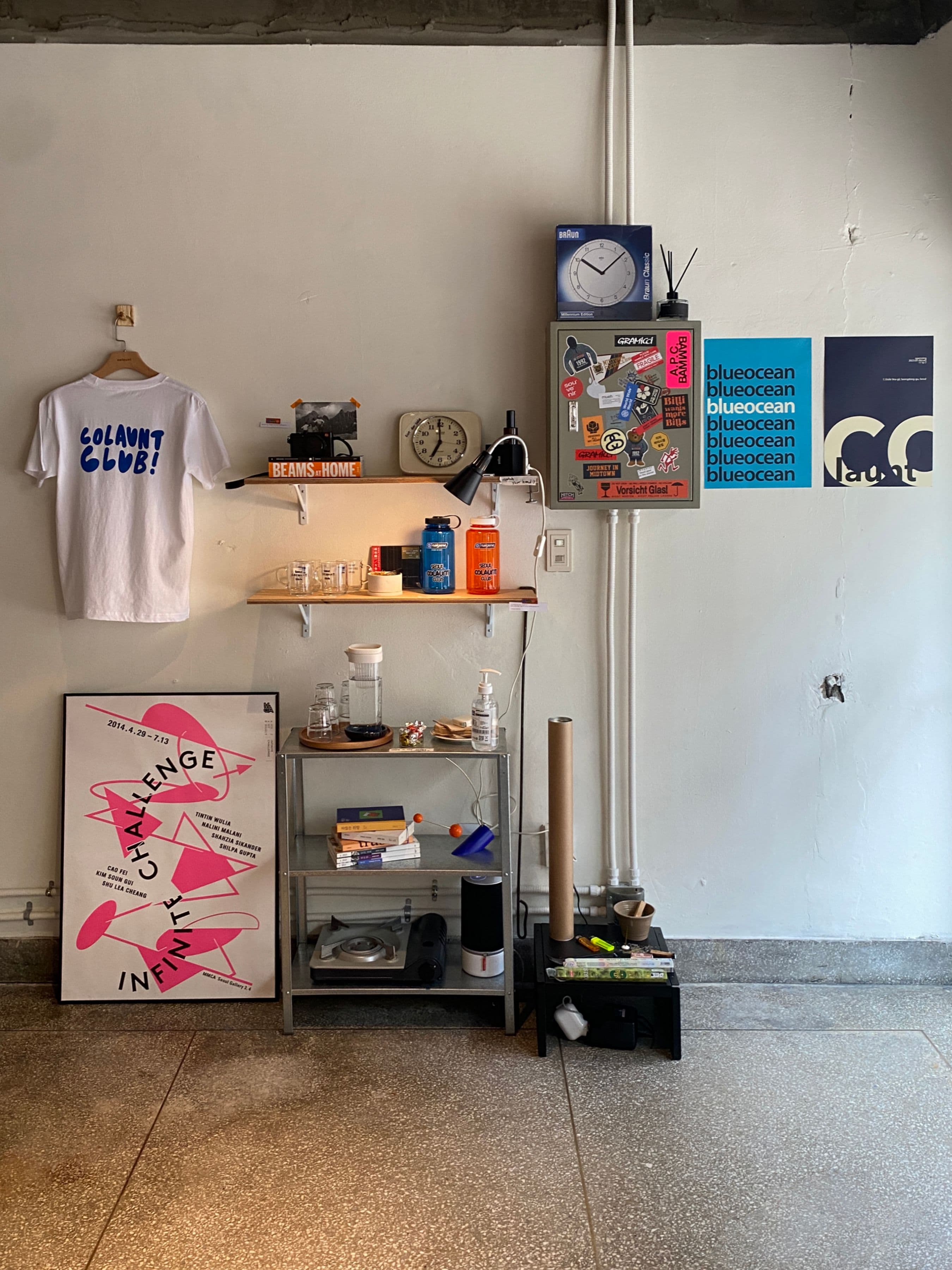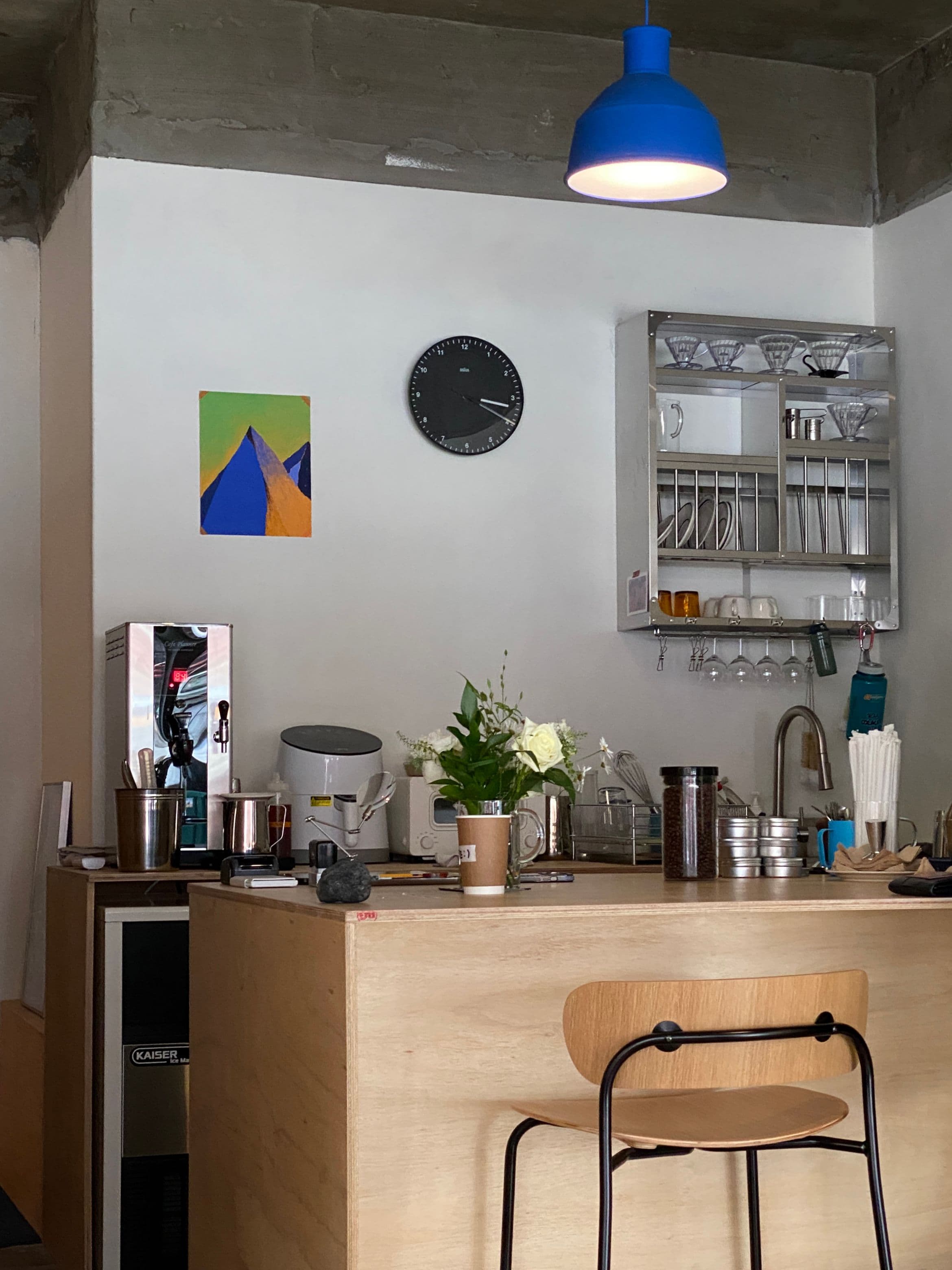 공간 안에는 커피바와 넷이 앉을 수 있는 큰 테이블, 그리고 벤치가 놓여 있어요. 북촌 코런트에 있던 파란색 조명이 익숙했고, 커피바의 디자인도 그대로 옮겨온 듯했습니다. 커피바 옆에 있는 진열장에는 대표님의 감성이 고스란히 묻어나는 굿즈와 여러 소품이 가지런히 놓여있습니다.