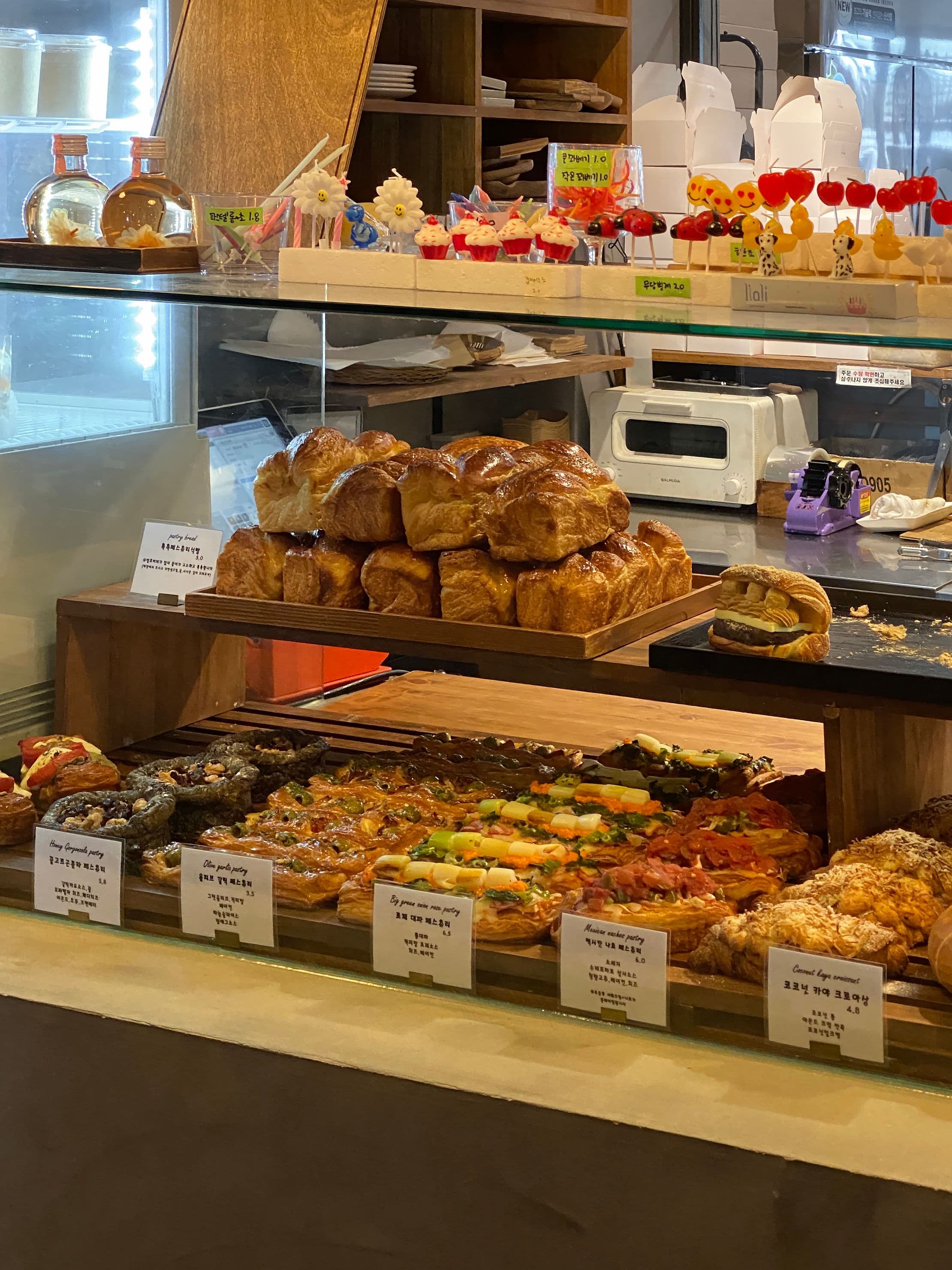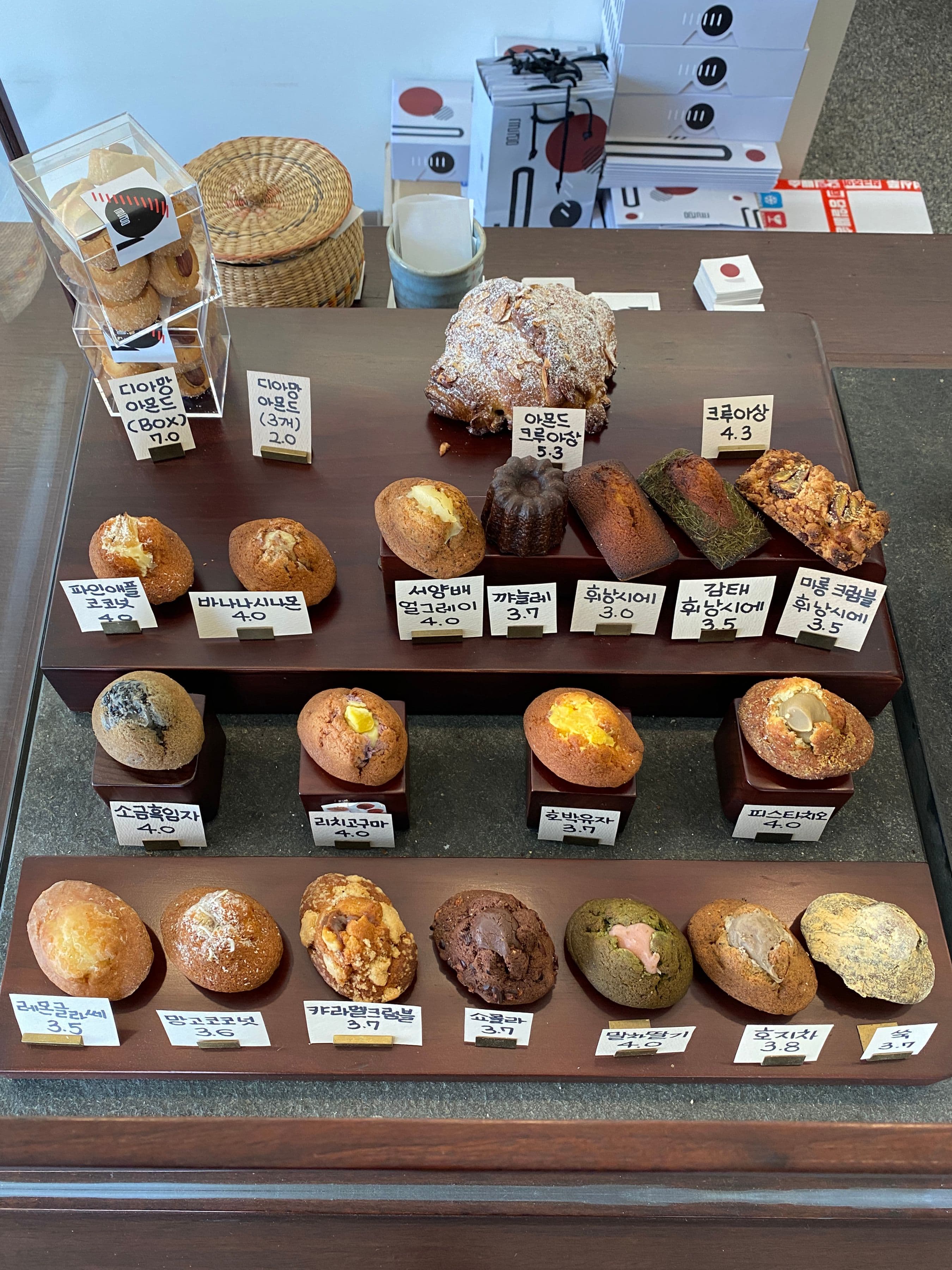 크림색 벽과 회색빛 바닥, 나무로 된 집기류 모두 논현동 매장의 인테리어 콘셉트 그대로 성수동 매장으로 옮겨왔습니다. 쇼케이스에는 독특한 재료로 만든 휘낭시에와 마들렌, 다양한 종류의 베이커리 메뉴로 가득한데요, 빵의 비주얼만으로도 벌써 이 곳이 '구움 과자 맛집'임을 짐작하게 합니다.