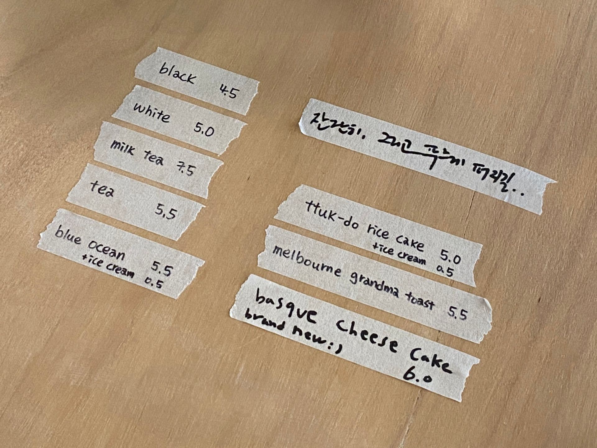 공간 인테리어와 집기까지, 북촌 매장 시절에서 쓰던 것들이 많았지만 성수로 이사하면서 한 가지 바뀐 점이 있습니다. 기존 핸드드립 방식에서 에스프레소 머신으로 커피를 내린다는 점이었어요. 그리고 뚝도시장에서 매일 공수해 오는 ‘뚝도 가래떡’이라는 메뉴도 새로 생겼습니다.