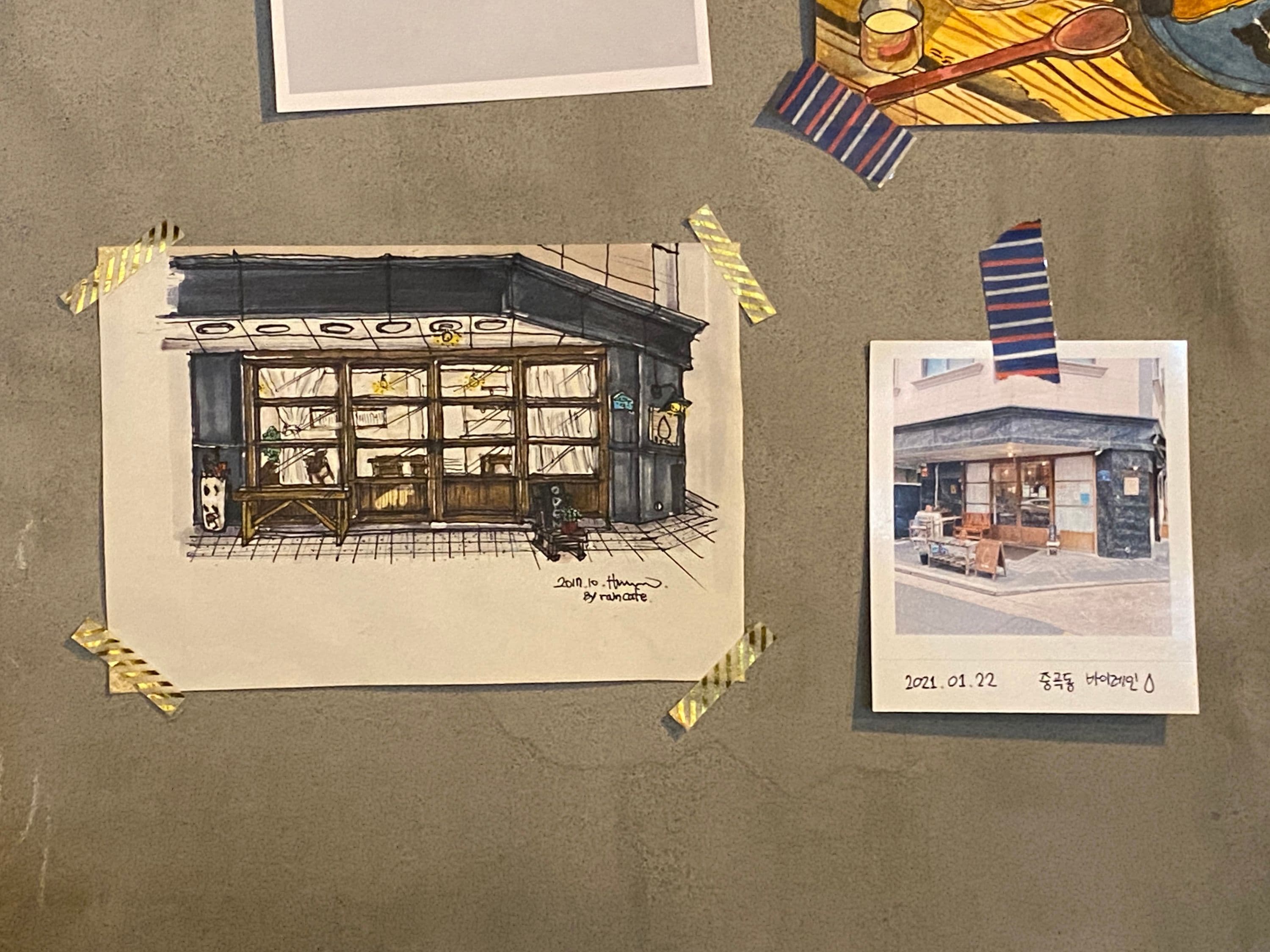 공간 한 쪽 벽면에는 중곡동 시절을 담은 추억의 사진과 그림들도 볼 수 있었습니다. 2017년 당시 매장 모습을 그린 그림, 마지막 영업 무렵에 찍은 폴라로이드 사진도 붙어있습니다. 중곡동의 바이레인의 추억이 고스란히 새 공간에 옮겨온 듯 했어요.